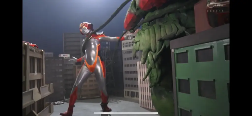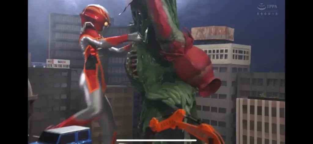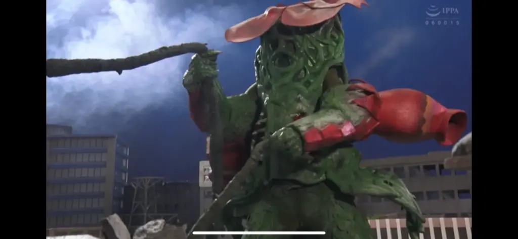 植物怪獣らしさ全開の攻撃を受ける巨大ヒロインに興奮します。
