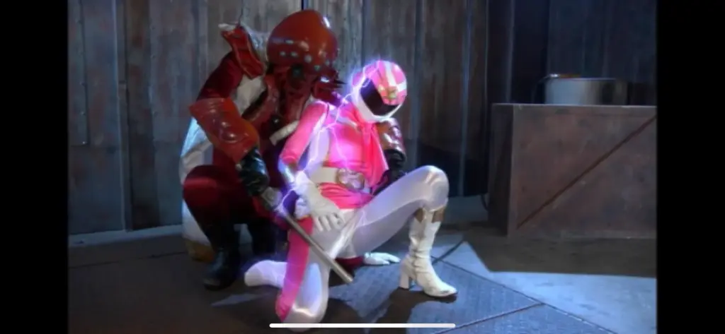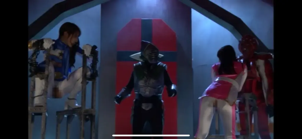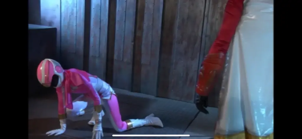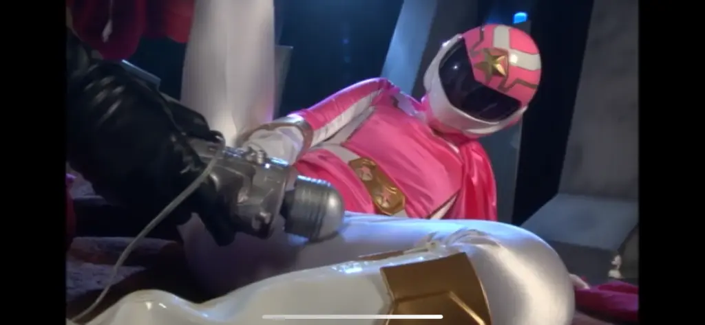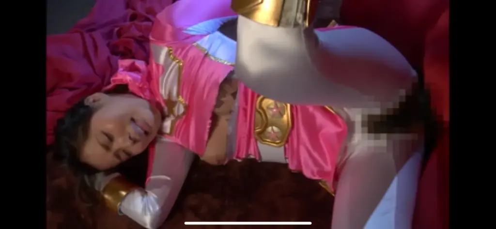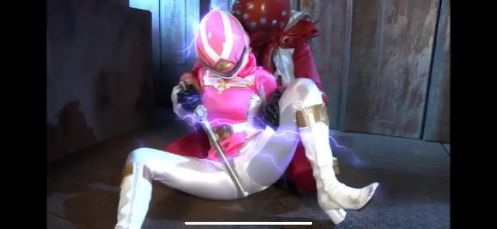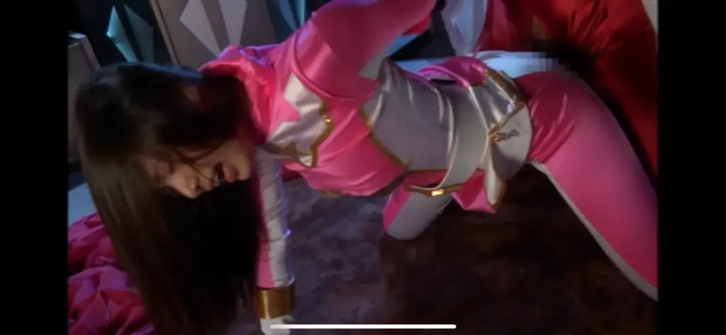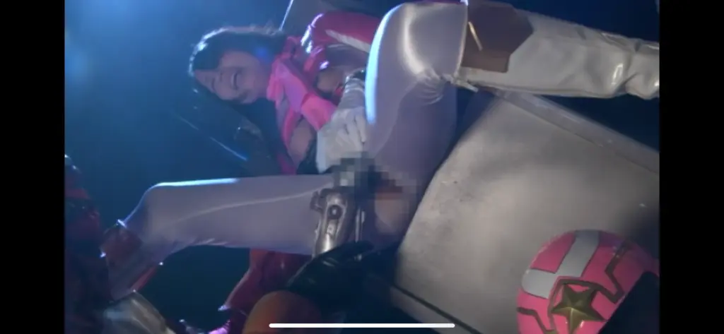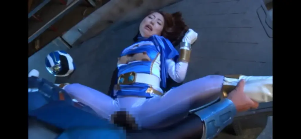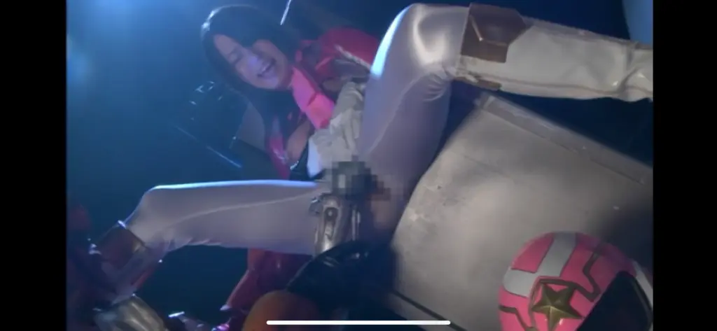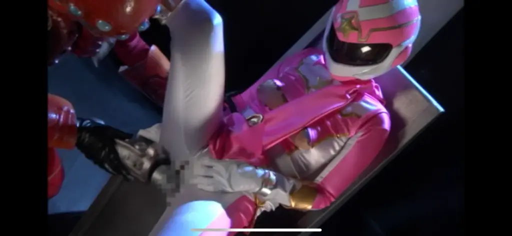 徐々に戦隊スーツを破壊され、股間とおっぱいも見えるようになります。